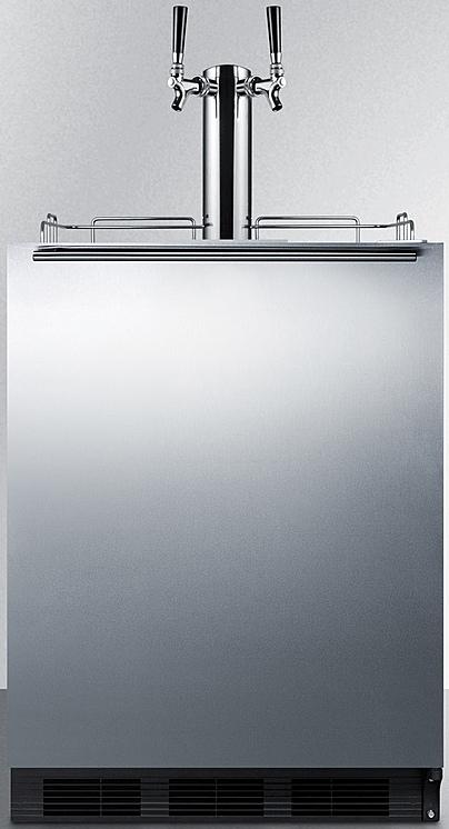 Sized at 32 inches high, the SBC58BLBIADA is designed to fit under lower ADA compliant counters. The front-breathing design allows built-in installation, while the fully finished black cabinet also enables freestanding use. This unit features a user-reversible 304 grade stainless steel wrapped door complete with a stainless steel handle mounted horizontally for a modern look. We include a guard rail (ships uninstalled) and removable two-piece stainless steel drip tray for cleaner service. The SBC58BLBIADA ships with a complete Sankey American dual tap kit complete with a draft tower, regulator, 5 lb. CO2 tank, and all the equipment you need to serve beer on tap.