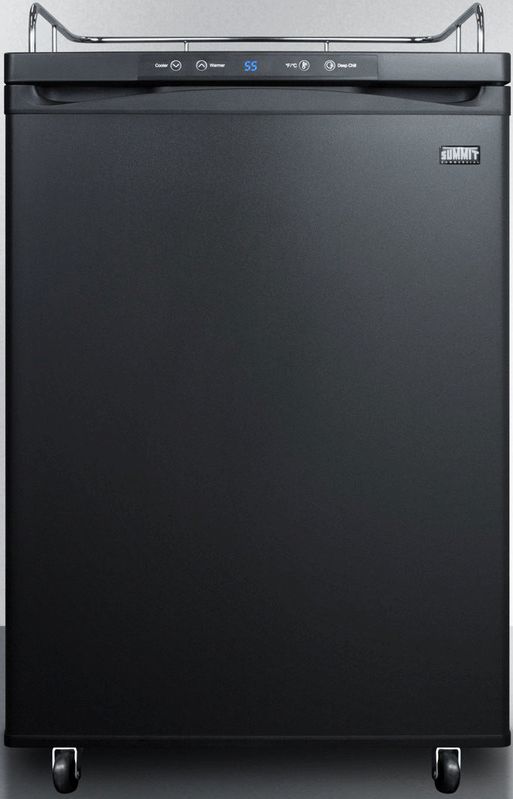 Summit Appliance offers a versatile line of full-sized freestanding beer dispensers designed for low maintenance storage in the style of your choice. The SBC635MNK features a large interior that can hold a full half, quarter, 0.17" or mini keg. No tapping equipment is included, allowing 'do-it-yourselfers' to customize the unit with their own system. It comes in a jet black finish. The surface includes a removable drip tray to collect spills and a chrome guard rail to help keep glasses and mugs in place. We include a set of locking casters for easy mobility. The user-reversible door swing makes it easy to accommodate any location’s setup. Automatic defrost operation ensures minimum user maintenance inside the 5.6 cu.ft. interior. A digital thermostat makes it easy to manage the temperature at the touch of a button. The external digital display shows the temperature in Celsius or Fahrenheit to ensure your beer is stored exactly how you like it. The floor is reinforced with a steel cover for added durability when loading kegs. This unit is designed for freestanding use. For built-in applications, see the SBC635MBINK.